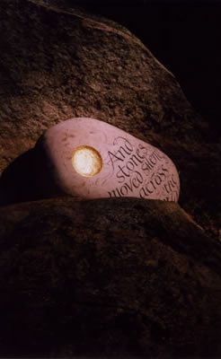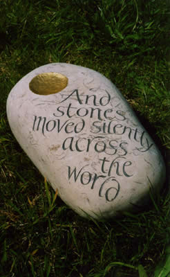 In September 2004 I travelled to the United States carrying a 23 kilogramme piece of limestone with the words And stones moved silently across the world carved into it. Before flying I sought permission from the American Embassy as I did not want them to open up my case, find a mysterious object and then destroy it just to be sure that it was safe. The Embassy very promptly informed me that it was fine to bring a stone into the country as long as there was no mud upon it.
